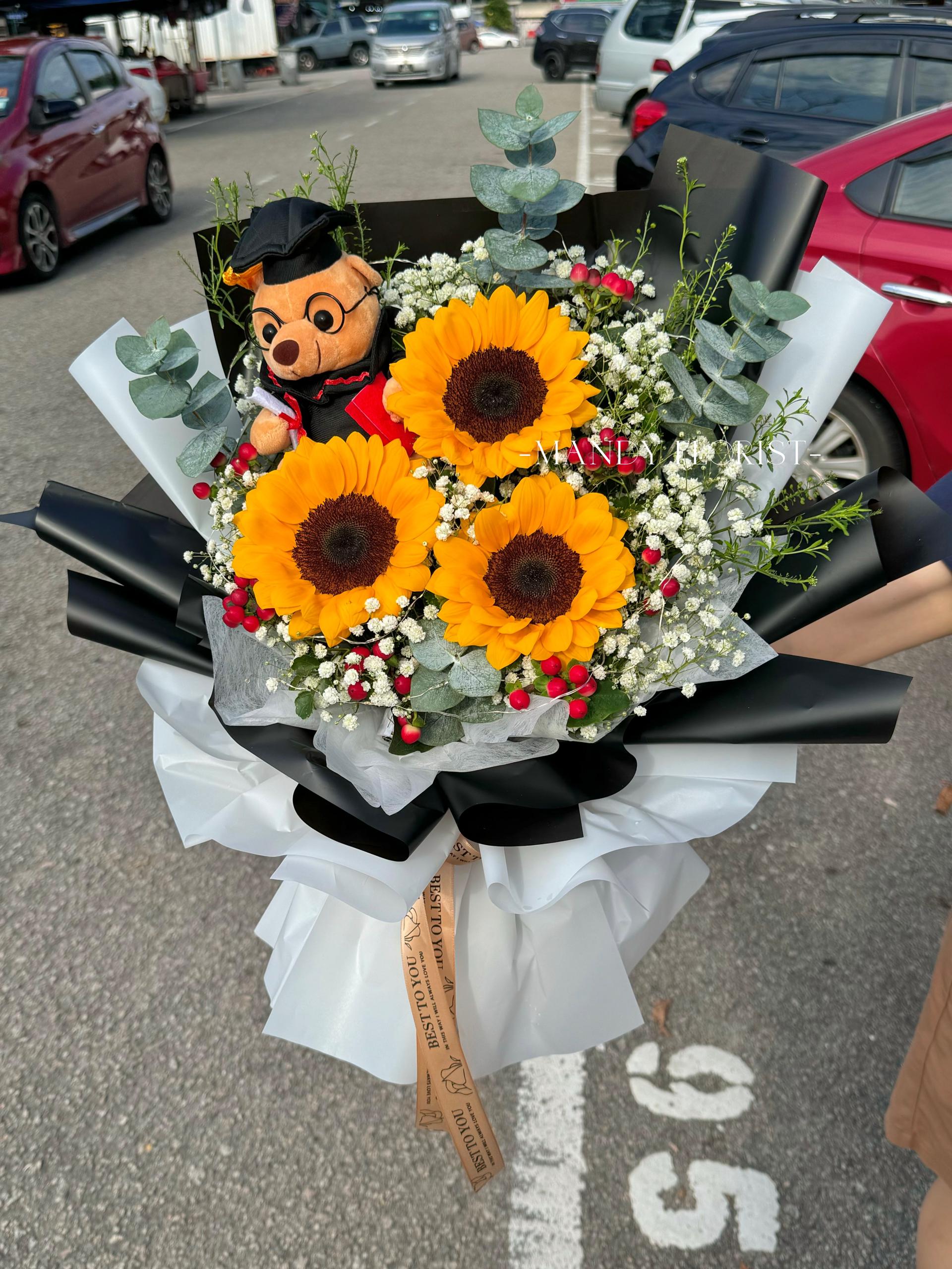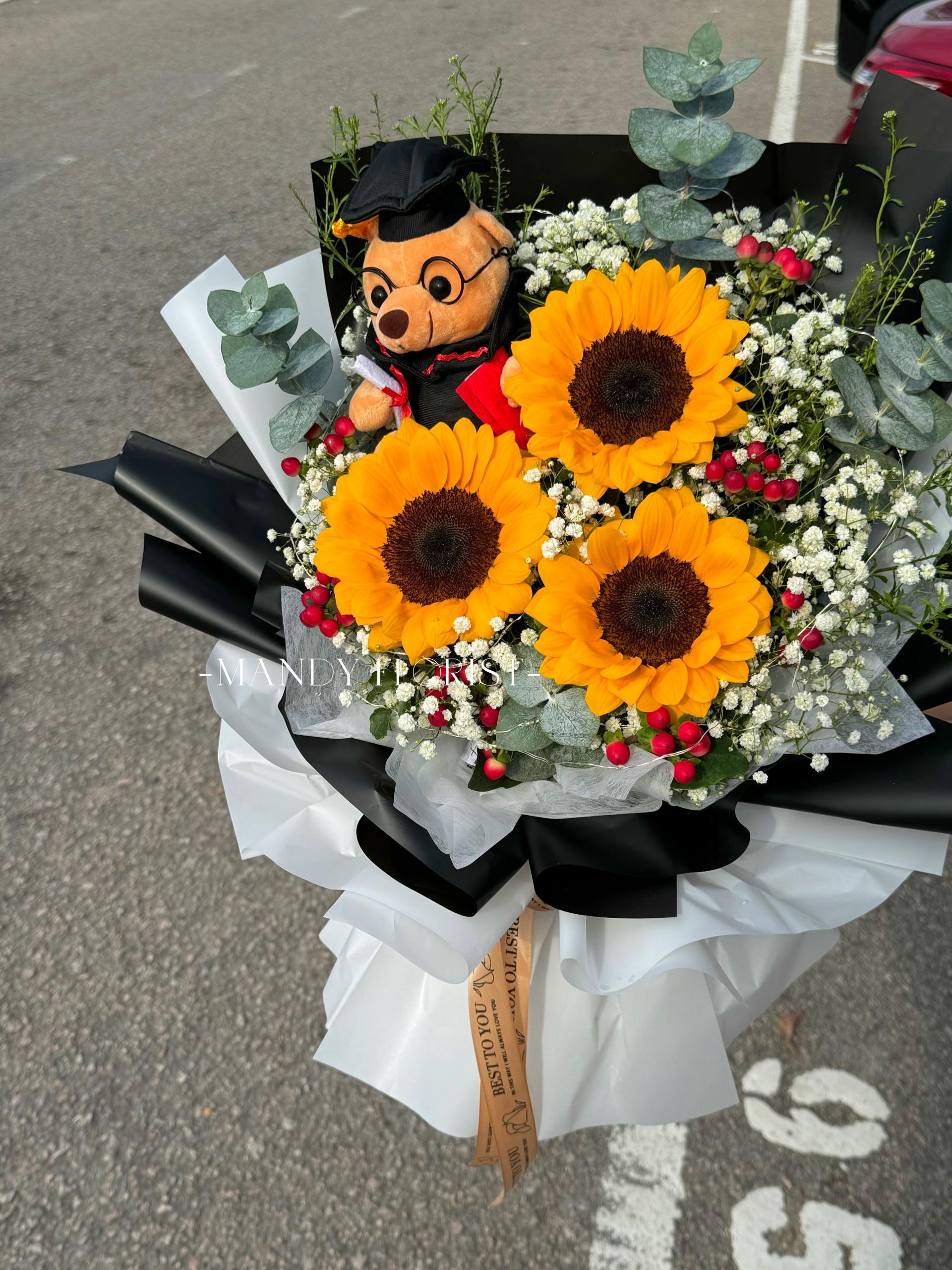 3 sunflowers, berries, baby’s breath, eucalyptus leaves